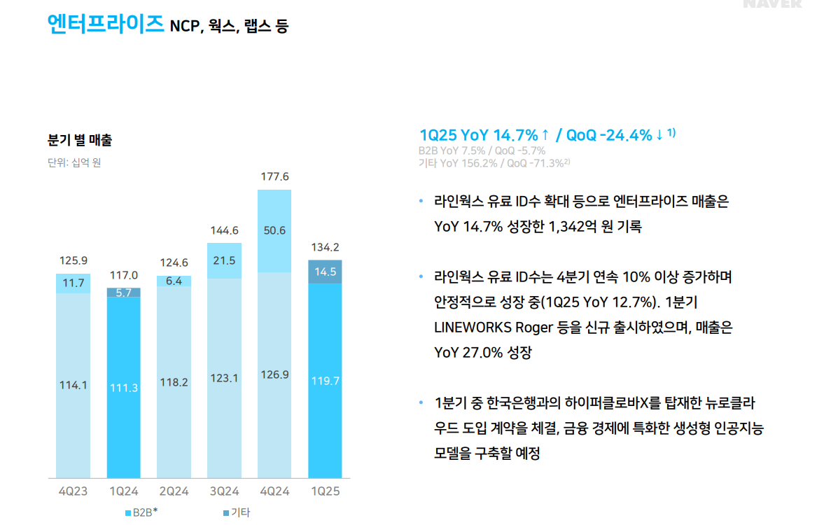 매출 1,342억 원으로 규모는 가장 작지만 전년 대비 +14.7% 증가하며 높은 성장률을 기록했습니다. 다만 전분기 대비 -24.4% 급감했는데, 이는 전분기(2024년 4분기)에 대형 계약이나 일회성 매출이 있었던 데 따른 기저 효과로 풀이됩니다. 엔터프라이즈 부문은 기존 클라우드 사업을 포함하는 새로운 명칭으로, 라인웍스(Line Works) 기업용 협업도구의 유료 이용자 확대 등이 성장 요인입니다