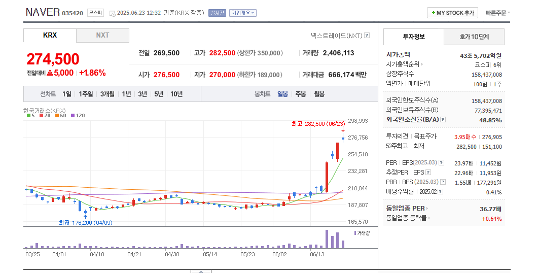 저번주부터 정부의 AI 정책 지원이라는 키워드로 네이버는 단기간에 30% 이상 급등을 하였고 거래량이 폭발하기 시작했습니다. 향후 몇 년간 실적 개선 기대치마저 상향 조정하고 있습니다. JP모건 등은 네이버의 밸류에이션을 재평가하여 정부 지원 하에 중장기 성장률이 높아질 것으로 전망하기도 했습니다. 현재 네이버의 매수세는 당분간 네이버 주가를 떠받치는 중요한 축이 될 것이며, 운이 좋다면 월봉차트의 최고점까지 도달할 가능성도 충분히 있어보입니다.