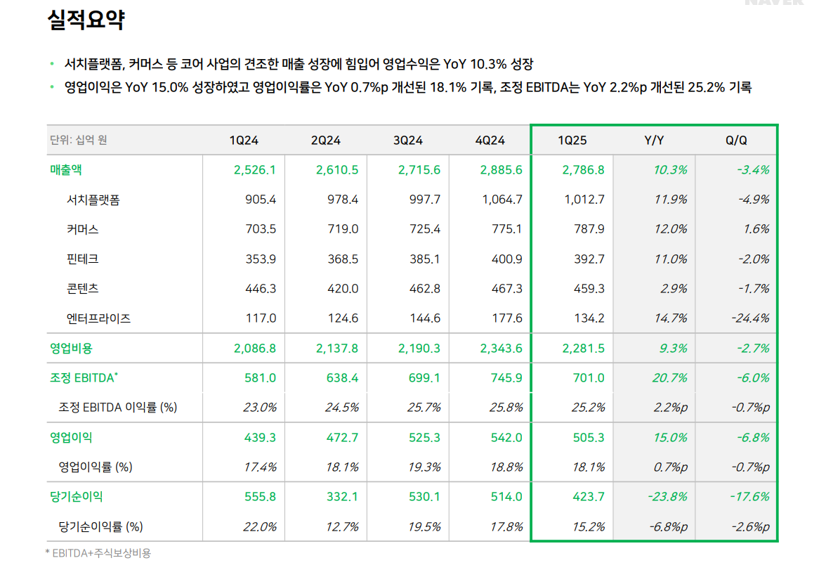 네이버는 2025년 1분기에 역대 1분기 사상 최대 실적을 기록했습니다. 연결 기준 매출은 2조 7,868억 원으로 전년 동기 대비 10.3% 증가했고, 영업이익은 5,053억 원으로 15.0% 성장했습니다. 영업이익률은 *18.1%*로 전년보다 0.7%p 개선되었으며, 조정 EBITDA는 7,010억 원으로 20.7% 증가했습니다.