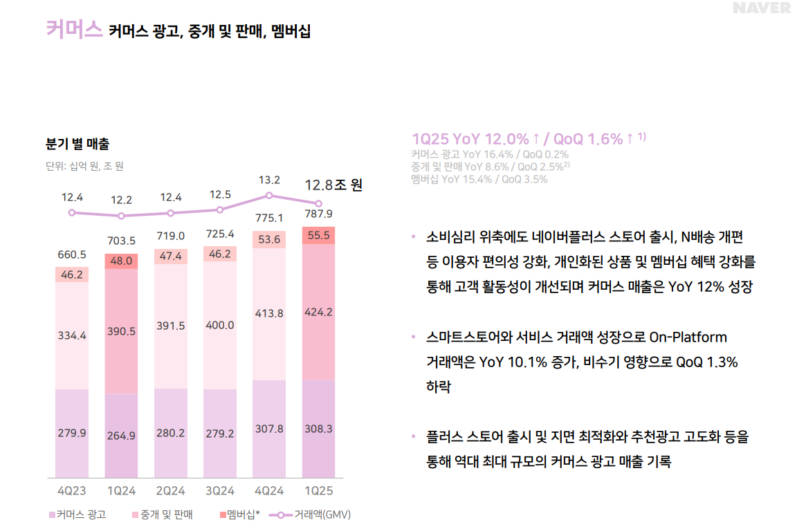 매출 7,879억 원으로 전년 대비 +12.0%, 전분기 대비 +1.6% 증가하며 견조한 상승세를 보였습니다. 네이버플러스 멤버십 스토어 출시, N배송 개편, 멤버십 혜택 강화 등이 주효했고, 1분기 스마트스토어 거래액 증가로 온플랫폼 거래액이 전년 대비 10.1% 증가하는 등 커머스 부문의 성장을 견인했습니다. 특히 커머스 광고 매출은 역대 분기 최고치를 기록하며 수익 기반을 강화했습니다
