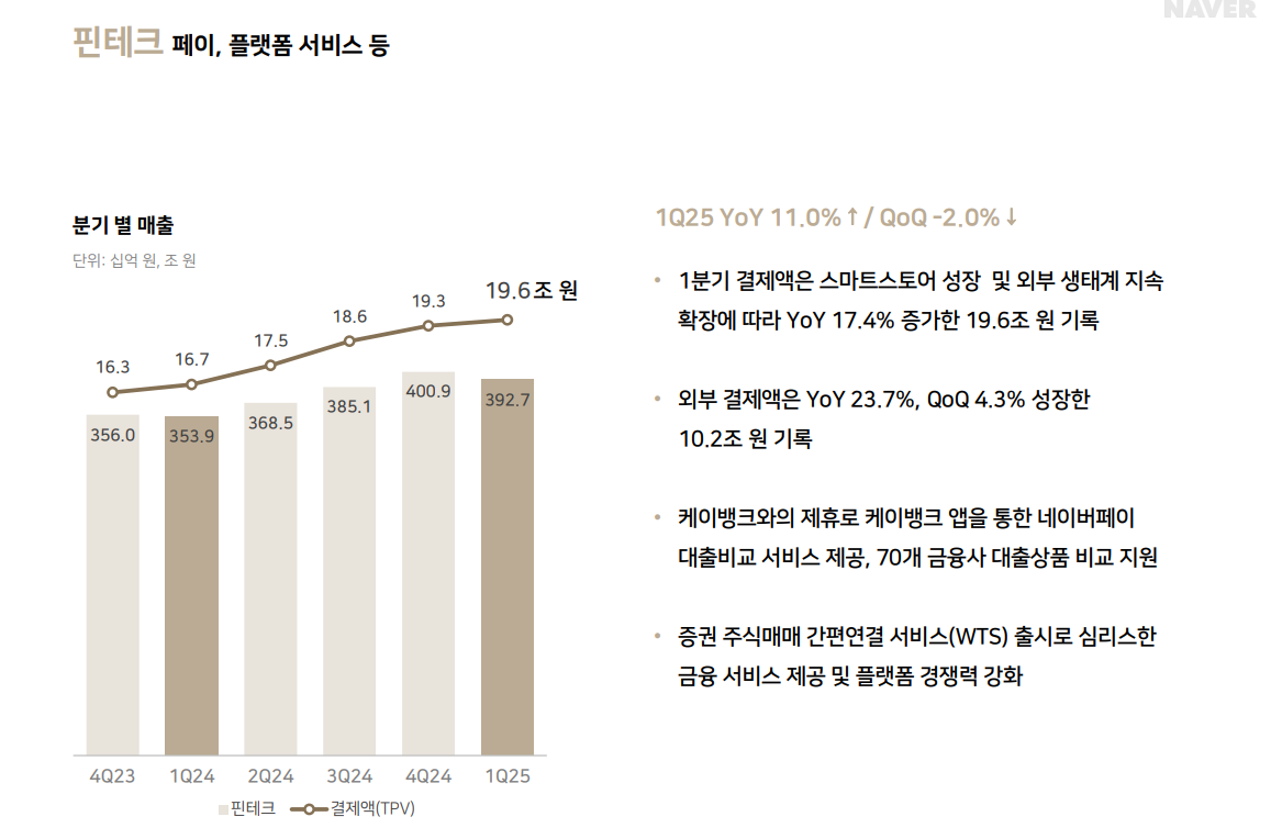 매출 3,927억 원으로 전년 대비 +11.0% 증가, 전분기 대비 -2.0% 감소했습니다. 네이버페이 결제액은 19조 6천억 원으로 전년 동기 대비 17.4% 증가하며 핀테크 실적을 뒷받침했습니다. 스마트스토어 성장과 외부 제휴 확대를 통해 결제 생태계가 커졌고, 4월에는 **증권사 간편주문 서비스(WTS)**를 선보이는 등 금융 서비스 영역을 확장하고 있습니다.