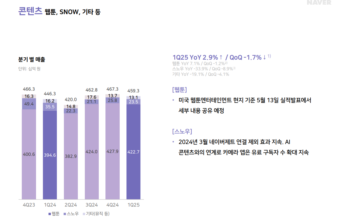 매출 4,593억 원으로 전년 대비 +2.9% 성장하여 다소 정체된 흐름을 보였고, 전분기 대비 -1.7% 소폭 감소했습니다. 웹툰을 비롯한 콘텐츠 사업은 글로벌 이용자 기반 확대로 꾸준한 매출을 유지했으나, 전반적으로 성장률은 다른 부문 대비 낮았습니다.