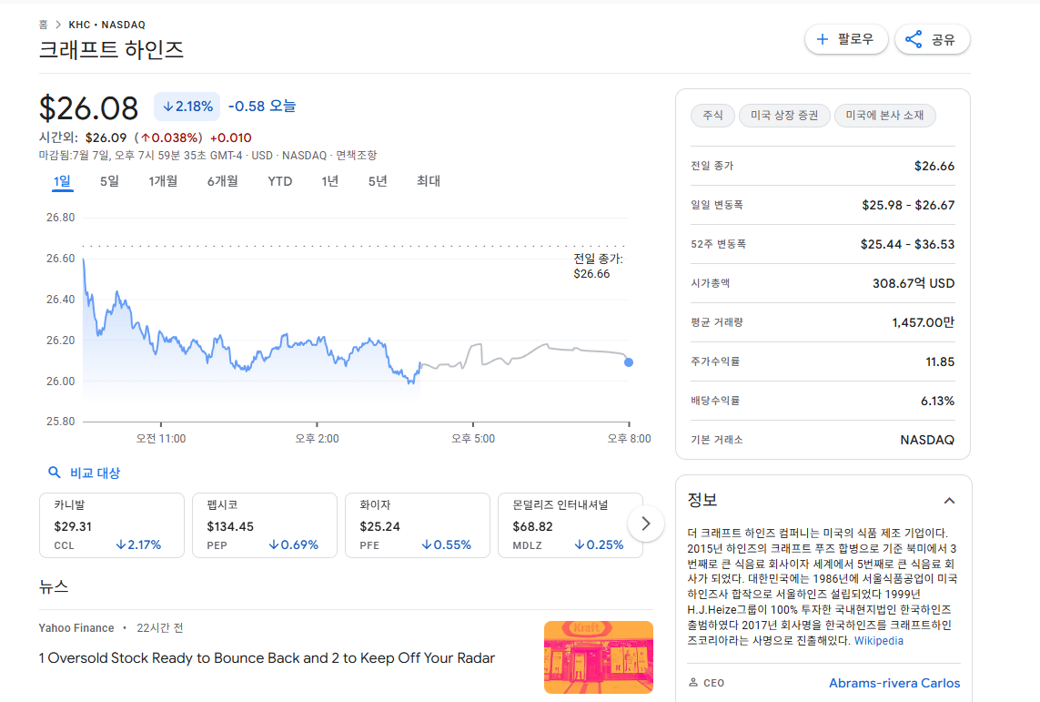 크래프트 하인즈를 이야기할 때 빼놓을 수 없는 것이 바로 배당입니다. 회사는 오랜 기간 꾸준히 배당금을 지급해왔고, 현재도 시장 평균 대비 높은 배당수익률을 제공하고 있습니다.