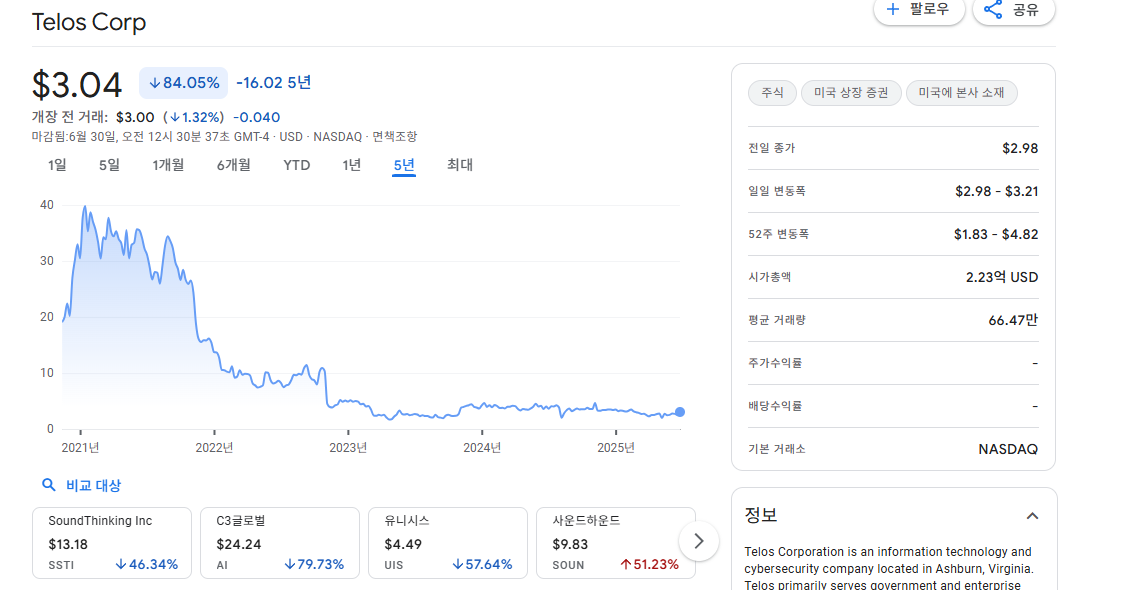 현재 텔로스의 시가총액은 1억 8천만 달러, 주가는 3.04달러 수준입니다. 동종 업계 경쟁사들(BAH, LDOS, CACI, SAIC)의 평균 시총이 5억~200억 달러인 점을 고려하면 상당히 저평가된 상태입니다.